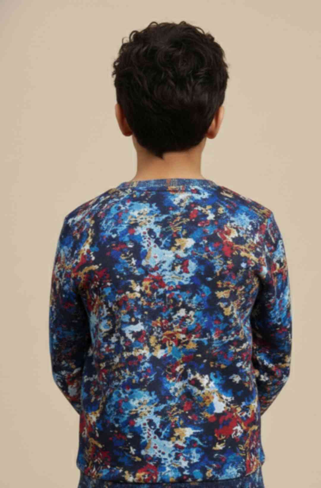 Blue self-design pullover featuring a classic round neck, long sleeves, and a ribbed hem for a comfortable fit. Ideal for keeping your child cozy during winter days.