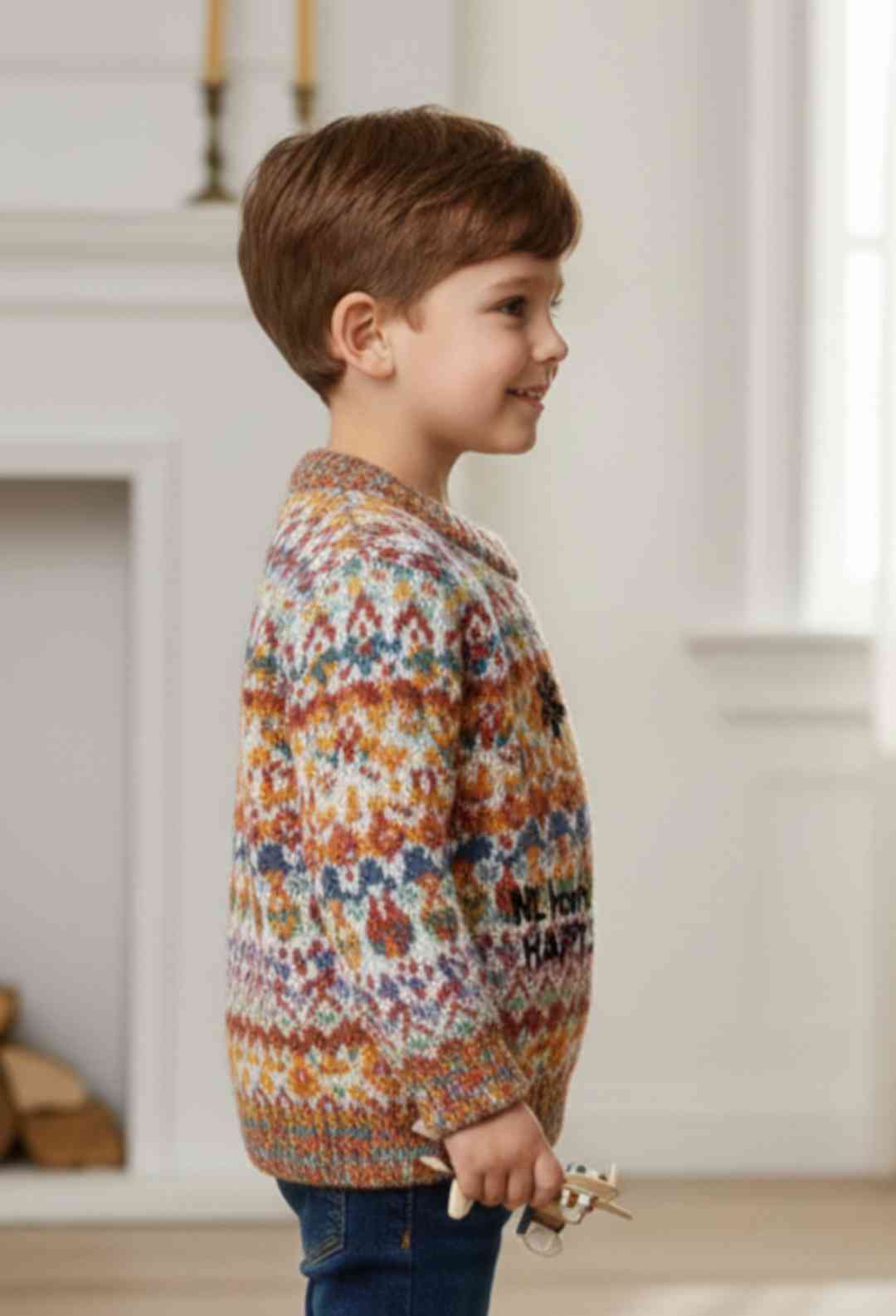Blue self-design pullover featuring a classic round neck, long sleeves, and a ribbed hem for a comfortable fit. Ideal for keeping your child cozy during winter days.