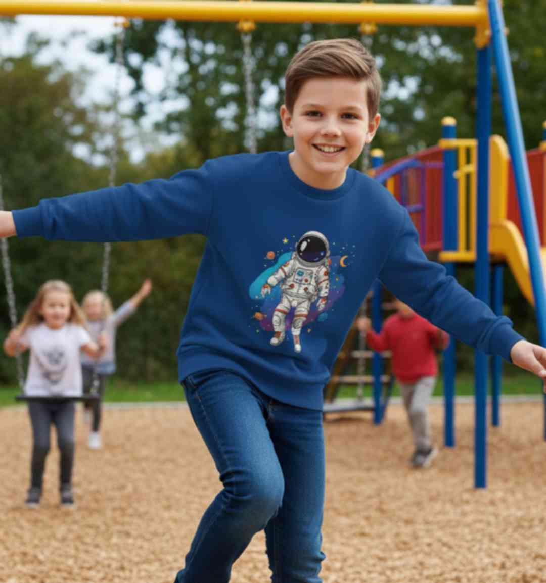 Green printed sweatshirt for boys featuring a classic round neck and long sleeves.