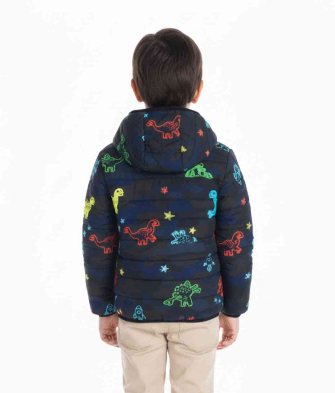 Black and charcoal grey camouflage print padded jacket, has an attached hood, two pockets, zip closure, long sleeves, straight hem, and soft polyester lining. Designed to keep your child warm and comfortable.